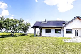Надзвичайно вражаючий та зручний одноповерховий будинок з чітко визначеними господарськими зонами. Цікавий дизайн корпусу, сучасні деталі та продумане поєднання різних оздоблювальних матеріалів надають йому неповторного вигляду. Увагу привертає чудово облаштована, велика зона відпочинку на відкритому повітрі, що складається з критої тераси з літньою їдальнею та зоною відпочинку, накритою сучасною перголою. На фронтальному фасаді було спроєктовано функціональну аркаду, завдяки якій вхід до будинку був захищений від несприятливих погодних умов. L-подібна форма будівлі дала можливість природного поділу денної та нічної зони шляхом розміщення їх в окремих крилах. Це рішення забезпечить жителям більшу свободу та підвищить рівень комфорту. Вітальня, повна природного світла, є ідеальним місцем для спільного сімейного відпочинку, який зимовими вечорами буде ще приємнішим завдяки сяйві романтичного каміна. Відкриття стелі над вітальнею та їдальнею посилює враження просторості інтер'єру та дало можливість використовувати високі вікна у вітальні, які підкреслюють її сучасний характер та забезпечують цікавий візуальний ефект. З вітальні можна потрапити на криту терасу, а центральне місце житлової зони займає представницька їдальня. По осі великого столу було спроєктовано широке розсувне скління тераси, що забезпечує плавне сполучення з садом. Їдальня з'єднана з кухнею довгим півостровом, який може бути оформлений у вигляді барної стійки, але також служитиме додатковою робочою поверхнею. Кутове вікно забезпечує гарне освітлення кухонної зони, де комфортна робота буде забезпечена за рахунок правильної організації функцій, додаткове місце для зберігання запасів продуктів пропонує комора. Житлова зона будинку доповнена туалетом, спроєктованим поруч із вестибюлем. Приватна зона "Будинок у мажанках" складається з трьох добре розташованих, світлих спалень та ванної кімнати. У кімнаті батьків, із якої можна вийти на терасу, також спроєктовано окремий гардероб. У проєкті є багато місць, де можна встановити шафи, які дають змогу зручно зберігати одяг усіх членів сім'ї. Газова котельня поєднана з пральною, це приміщення розташоване поруч із тамбуром. Представлений проєкт будинку відноситься до популярних категорій: проєкти сучасних будинків та проєкти одноповерхових будинків.