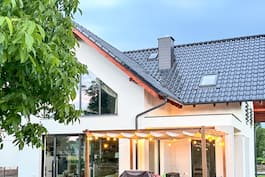 Проєкт сучасного односімейного будинку з житловою мансардою та гаражем, злегка виступаючим за лінію фронтального фасаду. Проєкт підійде для реалізації на не надто широких ділянках. Композиція фасаду представляє собою вражаюче поєднання світлої штукатурки з дерев'яним облицюванням і фактурним бетоном, що забезпечує привабливий зовнішній вигляд масиву. Головний вхід практично прикритий навісом, а з боку саду знаходиться простора тераса з сучасною перголою. Увагу привертають великі засклені елементи, завдяки яким будинок відкритий для зовнішнього огляду. Житлова зона, повна природного світла, пропонує затишну вітальню з виходом на терасу, їдальню з великим столом і кухню з островом з барною стійкою і робочою поверхнею в центрі. Прямо з кухні можна потрапити у велику кімнату, яку можна використовувати як комору, там також є місце для газової плити і вихід в гараж, що робить зручним завезення покупок. На протилежному боці холу на першому поверсі є додаткова кімната, яку можна використовувати в якості домашнього офісу і створити ідеальні умови для віддаленої роботи. Поруч з ним спроєктована ванна кімната з душем. Практичним корисним рішенням є невелика комора, відокремлена від тамбура, яка закривається розсувними дверима. Мансарда - це комфортна нічна зона будинку. Тут в розпорядженні батьків велика спальня з оригінально заскленим вікном. У цій кімнаті також передбачено місце для письмового або туалетного столика, а також місткі шафи, які разом з окремою вбиральнею гарантують зручне зберігання речей. Решта дві кімнати відведені під дитячі спальні, які отримують хороше природне освітлення через французькі балкони і мансардні вікна. Функціональне планування мансарди доповнено ванною кімнатою і місткою пральнею з місцем для сушки і прасування, завдяки чому набагато простіше організувати повсякденні домашні справи. "Будинок в Ковилі 2 (Г2)" належить до колекції: проєкти будинків з житловою мансардою, проєкти будинків з офісом на першому поверсі, проєкти будинків в сучасному стилі, проєкти будинків з гаражем на дві машини.