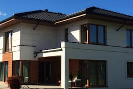 Сучасний дизайн будинку з класичною формою та елегантним облицюванням. Велике скління чудово освітлює інтер'єр і природно з'єднує будинок з садом. Простора вітальня вміщує зручні дивани перед каміном та домашній кінотеатр, а панорамне та кутове скління забезпечує чудовий вид на сад. Велика, частково крита тераса - ідеальне місце для відпочинку за будь-якої погоди та привабливий літній кавовий куточок. Кутове вікно висвітлює відкриту кухню. Додаткова кімната ідеально підходить для кабінету. У підсобне приміщення - котельню та великий гараж можна потрапити з просторого передпокою. Комфортна нічна зона розташована на першому поверсі. Спальня батьків виконана у формі кімнати з просторою та зручною ванною кімнатою та місцем для містких стінних шаф. Дві дитячі кімнати, кабінет та ванна кімната винятково просторі та добре освітлені кутовими вікнами. Проєктування другого поверху як повноцінного дозволяє вільно використовувати велике скління для освітлення приміщень. Вілла Вероніка 3 відноситься до категорії: проєкти двоповерхових будинків та сучасні проєкти будинків.