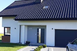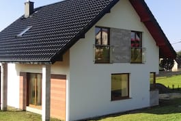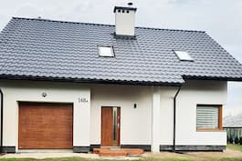 Невеликий будинок із сучасною архітектурою та функціональним внутрішнім простором. Критий вхід веде нас усередину. На першому поверсі знаходиться вітальня відкритого типу з каміном, виходом на криту терасу та зручна кухня, поєднана з коморою. Велика, світла ванна кімната з вікном використовує простір під сходами, а котельня дозволяє вільно використовувати опалення, відмінне від газового. Сходи з майданчиком ведуть на другий поверх, де спроєктовані чотири спальні та ванна кімната з окремою пральною. Спальня батьків обладнана гардеробом, у кожній кімнаті є великі балконні двері. У проєкті передбачені зручні місця для зберігання речей, наприклад у вигляді вбудованих шаф. Доступний, дешевий у будівництві будинок. Економічний формою дах, без мансардних вікон, позитивно впливає на енергетичний баланс будівлі. Увагу привертає ретельно продумана форма рельєфу та точний вибір оздоблювальних матеріалів.