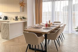 Відмінна сучасними лініями, ця двоповерхова резиденція із чудовим житловим простором на першому поверсі. Тут розташовані вітальня, їдальня та кухня, а завдяки широким вікнам та виходу на терасу, з цих кімнат відкривається вид на вулицю та сад. Кутовий камін, видимий з вітальні та їдальні, сприяє спільному дозвілля біля каміна. Додаткова кімната розташована в глибині першого поверху безпосередньо у ванній кімнаті, завдяки чому вона може успішно виконувати функцію гостьової кімнати. На другому поверсі ми спроєктували чотири кімнати, які завдяки повній висоті можуть бути вільно організовані. Батьківська спальня з власною гардеробною та ванною кімнатою та виходом на терасу. Проєкт будинку, що відрізняється пропорційною солідністю, сучасним дизайном фасадів та просторим, комфортним інтер'єром.