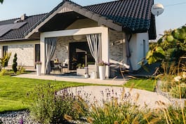 Функціональний одноповерховий будинок з чітким поділом зон використання та великим склінням, що забезпечує світло у всіх приміщеннях. Вхідна зона відрізняється практичним еркером, підкресленим кам'яним облицюванням, а з боку саду – привабливим навісом для тераси. Житлова площа будинку складається зі світлої вітальні із їдальнею та відкритою кухнею. Зона вітальні спроєктована як комфортний простір із місцем для зручних диванів перед домашнім кінотеатром та великим виходом на терасу. Кухня привертає увагу багатофункціональним кухонним островом – залежно від ваших потреб він буде, наприклад, барною стійкою для сніданку або додатковою робочою поверхнею. Зручний перехід із передпокою на кухню забезпечує невелика комора. У приватну зону можна потрапити з коридору - там знаходяться три добре розташовані спальні, ванна кімната та пральня. У спальні батьків є своя вбиральня. Господарська частина будинку включає гараж з окремим виходом і котельню на твердому паливі.