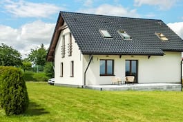 Проєкт окремого будинку з житловою мансардою та гаражем на одну машину, який відноситься до колекції проєктів невеликих будинків та проєктів недорогих будинків. Він пропонує інвесторам раціональні функціональні рішення та низьку вартість будівництва. На економічність його реалізації впливає проста та компактна форма корпусу будинку, увінчаного двосхилим дахом. Сучасний характер будівлі підкреслюється натуральним облицюванням, яке елегантно оголюється на тлі світлої штукатурки. Цікаві оригінальні балюстради, що захищають фасади. Розширені карнизи даху створили практичний навіс над входом. Через тамбур та хол ми потрапляємо у житлову зону. Вітальня з кутовим диваном перед каміном і домашнім кінотеатром сприяє відпочинку. Функціональна зона для сніданку поєднує їдальню з кухнею. Зручність роботи на кухні забезпечується плануванням із практичним розташуванням функцій. На першому поверсі є ванна кімната з душем. Через котельню, доступну з тамбуру, можна пройти в гараж, де було виділено підсобне приміщення з окремим виходом надвір. Сходи, видимі з вітальні, ведуть у нічну зону на мансарді. Тут спроєктовані три добре розташовані кімнати, що забезпечують комфортний простір для сну та навчання. У спальні є просторий гардероб, а в інших кімнатах можна встановити місткі шафи. Програма доповнена ванною кімнатою з природним освітленням, де є ванна і душ. Проєкт "Будинок у брусниці 2 вер.2" - це поєднання сучасних тенденцій та практичних рішень.