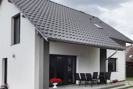 Проєкт окремого будинку з житловою мансардою, з колекції проєктів невеликих будинків та недорогих проєктів будинків. Це цікава пропозиція для інвесторів, які шукають невеликий будинок та функціональні просторові рішення, що гарантують комфортне використання для сім'ї. На економічність реалізації впливають компактний корпус та класичний двосхилий дах. Приглушені кольори штукатурки, засклені балюстради, що захищають портьєри, і дерев'яне облицювання надають всій будівлі сучасного характеру. Вхід веде через великий вестибюль до житлової зони першого поверху. У вітальні є зручний м'який куточок та обідня зона з місцем для сімейного столу. Широке скління забезпечує велику кількість природного світла та відкриває будинок до саду. Частково крита кутова тераса створює привабливу зону відпочинку на свіжому повітрі. Камін вбудований у межу кухні, оптично відокремлюючи її від решти першого поверху та створюючи приємну атмосферу. Практично спроєктована кухня містить барну стійку для сніданку, просторі стільниці та високі вбудовані шафи. Його функціональне планування доповнює розташована поруч комора. Додаткова кімната з прилеглою ванною може бути використана як зручна гостьова спальня. З вестибюля можна потрапити до котельні. Подвійні сходи ведуть до приватної зони в мансарді. Тут ви знайдете три світлі та просторі спальні з місцями для практичних шаф. Зручна ванна кімната спроєктована з достатнім простором для встановлення кутової ванни, душової кабіни та двох умивальників. Програма мансарди доповнена практичним гардеробом та пральною з функцією сушарки.