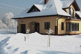 Проєкт будинку з гармонійною архітектурою і функціонально оформленим внутрішнім простором. Розташований в центрі вхід в будинок був підкреслений красивою аркадою. Перевага відкритої і просторої денної зони, що з'єднує вітальню з їдальнею і кухнею, полягає в можливості різноманітного розташування. Функціональну програму першого поверху доповнюють туалет, захований під сходами, комора, гараж з входом з вестибюля і котельня. Двухмаршеві сходи ведуть на мансарду до приватної зоні. Там є три світлі і зручні спальні з балконами та ванною кімнатою.