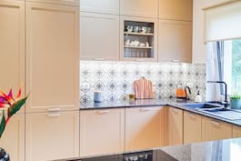 Це проєкт невеликого одноповерхового будинку, який чудово підходить для реалізації на вузьких ділянках. Будівля відрізняється простим корпусом, цікавий зовнішній вигляд якого надає сучасне оздоблення фасаду. Поєднання світлої штукатурки з натуральним облицюванням підкреслює стиль та унікальний характер будинку, а численні скління забезпечують відмінне природне освітлення інтер'єрів. Зона тераси чудово облаштована, її розміри дозволяють організувати літню їдальню та зону відпочинку з набором зручних садових меблів. Відкрите планування житлової зони робить інтер'єр візуально більш просторим. Їдальня, розташована в центрі, плавно з'єднується з вітальнею та кухнею. Просторий півострів може виконувати кілька функцій, він ідеально підходить як додаткове місце для їди, також можна організувати сучасну зону для приготування їжі. Окремі кімнати – це спальня батьків з виходом на терасу та дві добре розташовані кімнати для дітей. У всіх кімнатах є місткі шафи, завдяки яким легко підтримувати порядок. "Будинок під апельсином" відноситься до таких категорій, як: проєкти одноповерхових будинків, проєкти будинків для вузької ділянки, проєкти невеликих будинків, а також проєкти сучасних будинків.