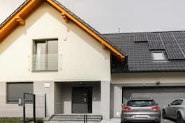 Простий і елегантний будинок у сучасному виконанні екстер'єру, підкреслений вхідною аркою та яскравим облицюванням, яке також можна замінити на темніший відтінок штукатурки. Ефектні двері ведуть у великий вестибюль. Житлова зона є просторою вітальнею з виходом на терасу, де є місце для домашнього кінотеатру і каміна, і затишну їдальню. Функціональний кухонний острів з'єднує вітальню з великою кухнею, що освітлюється кутовим вікном. Додаткова кімната на першому поверсі може служити як кабінет. Підсобна частина включає великий гараж і котельню на твердому паливі з незалежним виходом. У мансарді знаходяться три світлі та затишні кімнати, ванна кімната та пральня. У спальні батьків є своя вбиральня. Додатковою перевагою є проєктування просторої кімнати відпочинку над гаражем із прилеглою гардеробною.