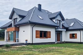 Мы представляем проект комфортабельного дома с жилой мансардой и гаражом на две машины. Это здание с интересной архитектурной формой, широкий корпус был покрыт шатровой крышей, а перед линией фасада выступил гараж на две машины. Крытый вход ведет через тамбур с гардеробом в прихожую хорошо освещенной жилой зоны. В передней части здания находится удобная и просторная кухня с уголком для завтрака и расположенной рядом кладовой. Рядом с кухней находится столовая, расположенная в светлом эркере с тремя окнами, с широким остеклением, соединяющим ее пространство с крытой частью террасы. Столовая примыкает к просторной гостиной с камином и двумя застекленными выходами на террасу. Дополнительная комната на первом этаже, также с выходом на террасу, может служить в качестве гостевой комнаты или кабинета. Рядом находится ванная комната. В мансарде мы спроектировали комфортную приватную зону, которая включает комнату родителей с ванной комнатой и гардеробной, и две детские комнаты, которые также оборудованы гардеробными. Четвертая комната расположена над гаражом и в зависимости от потребностей жильцов может служить еще одной спальней или зоной отдыха для всех членов семьи. "Дом в нагетках 2 (Н)" относится к следующим категориям: проекты домов с жилой мансардой, проекты домов с гаражом на две машины, проекты домов с кабинетом на первом этаже, небольшие особняки.