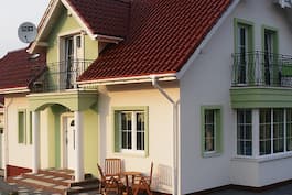 Красивый, односемейный дом с пропорциональным блоком и функциональным интерьером. Он был разработан с жилым чердаком и двойным гаражом. Первый этаж разделяется на жилую и хозяйственную зоны. Жилая зона представляет собой просторную гостиную с расположенным в центре камином, открытую кухню со столовой и ванную комнату. Преимуществом является дополнительная тихая комната, которая может выступать в качестве кабинета или гостевой спальни. Подсобная часть первого этажа состоит из котельной рядом с лестницей и гаража на две машины с удобным выходом в сад. Лестница из просторного зала ведет на мансарду, которая является жилой зоной для членов семьи. Зона отдыха состоит из четырех светлых спален, ванной комнаты с биде и угловой ванной. Помимо комнаты, над гаражом дополнительно предусмотрены гардеробная и комната отдыха. Снаружи здания вход был выделен колоннами и стильным окном, что придало фасаду шика и красоты.