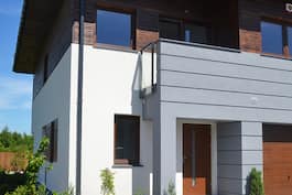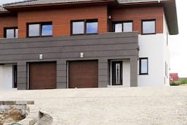 Элегантный дом с современными линиями, разработанный для сблокированного жилья. Гостиная объединяет кухню, столовую и хорошо освещенный телевизионный уголок в единое пространство. Гостиная со столовой, занимающая всю ширину дома, и условно разделенная кухня создают обширную и хорошо освещенную зону. Вид на камин, выход в сад и оконное решение в углу стены повышают привлекательность этой зоны. Большое остекление и широкий выход на террасу позволяют соприкасаться с зеленью. Мансарда предлагает четыре светлых и уютных комнаты и ванную комнату. Их преимущество - полная высота этажа и освещение через вертикальные окна. Балкон в комнате родителей также служит навесом в зоне входа. Очень красивый двухэтажный дом, выполненный в лучших традициях загородных вилл. Выбор архитектурных деталей и отделочных материалов отражает функциональную планировку внутри здания, а контраст между уровнями первого и цокольного этажей позволяет сохранить хорошие пропорции здания.