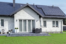 Современный проект одноэтажного дома с гаражом на две машины, относящийся к популярным среди инвесторов коллекциям: проекты небольших домов и проекты домов недорогих в строительстве. Это идеальное сочетание функциональных пространственных решений и экономичной реализации. Простой корпус дома с двускатной крышей был разноображен частичной кровлей над входом. Элегантная отделка фасада, светлая штукатурка, каменная облицовка и оконные рамы цвета дерева подчеркивают современный характер дома и хорошо вписывают его в окружающую среду. Интерьер дома был спроектирован в соответствии с принципом эффективного использования всего пространства. Жилая зона состоит из открытой гостиной с камином, столовой и полуоткрытой кухни. Большое остекление в гостиной естественным образом соединяет дом с террасой и открывает вид на сад. Большой угловой диван обеспечит приятный отдых перед телевизором для всей семьи, а камин создаст атмосферную обстановку. В функциональной и хорошо освещенной кухне можно разместить барную стойку для завтрака, удобные столешницы и высокие шкафы. Рядом с ним находится кладовая. Четко отделенная раздвижной дверью, ночная зона обеспечит жильцам комфортный отдых и чувство уединения. Рядом со спальней родителей был спроектирован гардероб, а удобная планировка двух детских комнат позволит установить практичные встроенные шкафы. Для общего пользования членов семьи предусмотрены туалет и ванная комната, оборудованная угловой ванной и душем. В гараж можно попасть из тамбура, за ним находится котельная с выходом на улицу.