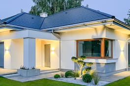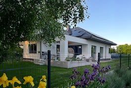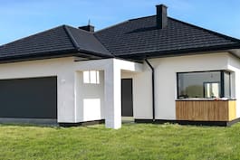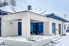 Это еще один проект из линейки "Дома в ренклодах". Представленная версия основана на проекте "Дома в ренклодах 2 (Г2)", но изменена крыша, расширена жилая зона, дополнительно спроектированы гардероб и пергола на террасе. Современный облик дома подчеркивается большим застеклением и соответствующей композицией отделки фасада. Белая штукатурка сочетается с бетонной облицовкой, цвет черепицы плоской крыши хорошо сочетается с тоном деревянной отделки. Терраса, покрытая современной перголой, приглашает жителей отдохнуть на свежем воздухе и является идеальным местом для летней столовой. Широкое, раздвижное застекление органично соединяет интерьер дома с садом. Большой угловой диван можно поставить в гостиной перед домашним кинотеатром и камином, создав комфортные условия для семейного отдыха. Столовая расположена в центральной части жилой зоны, из нее открывается привлекательный вид на сад. Просторная кухня, хорошо освещенная естественным светом, - удобное место для повседневной работы. Она включает в себя высокие встроенные шкафы, просторные столешницы, барную стойку для завтрака и удобную кладовую. Приватная зона дома очень четко отделена от жилой зоны и гарантирует комфортные условия для отдыха жильцов. Уединенная спальня родителей с выходом на террасу и гардеробная расположена в глубине дома. На другой стороне коридора находятся две детские комнаты с полностью оборудованной ванной комнатой между ними. Вместительные шкафы-купе, которые можно установить в прихожей, позволят удобно хранить одежду и бытовую технику. В "Дома в ренклодах 6 (Г2)" есть также вторая ванная комната и котельная, совмещенная с прачечной, которая имеет прямой вход снаружи. Просторный гараж на две машины доступен через тамбур. "Дом в ренклодах 6 (Г2)" принадлежит к коллекции: проекты одноэтажных домов, проекты домов с гаражом на две машины, проекты домов в современном стиле.