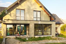 Впечатляющий дизайн дома, который идеально вписывается в узкие участки, отличается современным стилем отделки и функциональной планировкой помещений. Натуральные, деревянные и клинкерные фасадные облицовки выглядят очень привлекательно на фоне белой штукатурки, а стеклянные балюстрады подчеркивают современный стиль. Жилая зона исключительно представительна и роскошна. Широкий, панорамный проем на террасу делает интерьер красиво, естественно освещенным и обеспечивает жильцам прекрасный вид на сад. В гостиной с комфортом разместился удобный гостиный гарнитур с угловым диваном, где жильцы могут наслаждаться отдыхом перед камином или домашним кинотеатром. В смежной столовой установлен большой семейный стол и практичные шкафы для посуды и столовых принадлежностей. Крытая часть террасы может быть использована как летний кофейный уголок. Открытая кухня может быть оснащена высокой встроенной мебелью, а функциональный полуостров органично соединяет ее со столовой. Рядом находится кладовая с местом для морозильной камеры. Программа первого этажа дополнена дополнительной комнатой и ванной комнатой с душем. Из вестибюля, который также служит гардеробной, мы переходим в хозяйственную часть дома. Он состоит из гаража с двумя парковочными местами и котельной на твердом топливе, с отдельным внешним выходом. Двойная лестница ведет в удобную ночную зону на мансарде. Здесь спроектированы три исключительно удобные и светлые спальни, все с собственными выходами на балкон, а также кабинет с французским окном в эркере. В общей ванной комнате есть ванна, душ и два умывальника, рядом с ней находится прачечная с функцией сушки. В спальне родителей есть собственный гардероб, а в прихожей предусмотрено место для встроенных шкафов. Этот впечатляющий проект дома относится к популярным категориям: проекты современных домов, для узкого участка и с кабинетом на первом этаже.