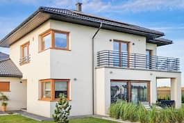Интересный проект дома в виде виллы, с элегантным фасадом, рисунок которого подчеркивает стильный руст. Симметричная, простая форма была покрыта плоской крышей с широкими навесами, а многочисленные остекления соединяют дом с садом и естественно освещают интерьер. Расширенный гараж позволил создать большую террасу на первом этаже, которая станет частным местом отдыха на свежем воздухе. Приглушенные цвета штукатурки и облицовки камня делают все это изысканным и привлекательным. Представительная дневная зона - это впечатляющие и комфортное пространство, которое зовёт всю семью расслабиться. Широкий переход в сад делает интерьер красиво освещенным и плавно соединяется с крытой террасой, где можно расслабиться в любую погоду. Просторная гостиная имеет угловой диван перед домашним кинотеатром и камином и большой семейный стол, который находится в стеклянном эркере. Размер столовой позволяет поставить большой стол во время праздников или семейных торжеств. Угловое окно освещает открытую кухню, что имеет преимущество оптимального количества кухонных столешниц и практической кладовой. К услугам гостей добавлен функциональный уголок для завтрака и столовая. В дополнительной комнате можно разместить кабинет или спальню для гостей, благодаря ванной комнате с душем, расположенным рядом с ним. С тамбура мы идем к большому двойному гаража, а затем в котельную на твердом топливе, которая имеет отдельный внешний выход и складское пространство. На первый этаж ведет естественно освещенная лестница, где разработана удобная и хорошо освещена ночная зона дома. К услугам гостей четыре светлые и регулируемые спальни и большая ванная комната с выходом в прачечную. В комнате родителей есть своя гардеробная комната, а в других спальнях есть место для больших настенных шкафов. Широкие балконы разработаны в виде террас, благодаря чему они выступают как дополнительные зоны отдыха на открытом воздухе. Представленный проект относится к популярным категориям домов: проекты двухэтажных, современных домов, с кабинетом на первом этаже и проекты небольших домов.