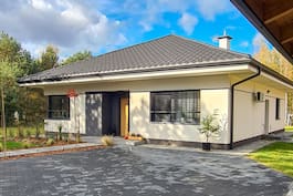 Это еще один интересный проект одноэтажного дома в семье "Дом в хакетиях". Компактный корпус дома покрыт шатровой крышей, отделанной плоской черепицей антрацитового цвета. Из сада была спроектирована арка, в которой была расположена крытая терраса, создающая идеальное место для летних обедов. Естественное очарование добавляет деревянная облицовка, которая была использована для подчеркивания отдельных фрагментов высоток. Относительно небольшое внутреннее пространство дома было оптимально освоено, и каждый квадратный метр использован функционально. Многочисленные остекления делают интерьер прекрасно освещенным и визуально более просторным. Четко разделенная жилая зона предлагает комфортные условия для совместного семейного отдыха и работы. В гостиной, открытой на террасу, разместился удобный лаунж-комплект перед домашним кинотеатром, в столовой - большой стол и привлекательный вид на сад, на кухне есть место для барной стойки и высоких шкафов, а дополнительное место для хранения обеспечивает прилегающая кладовая. В ночной зоне в распоряжении жильцов две детские комнаты, большая спальня родителей с гардеробом и две ванные комнаты. Газовая котельная совмещена с функцией прачечной, что облегчит поддержание порядка в доме. "Дом в хакетиях 5" - это современный одноэтажный дом из коллекции: проекты небольших домов, также относится к категории: проекты домов с шатровой крышей и проекты домов без гаража. Другие проекты из семейства "Дом в хакетиях" включают: "Дом в хакетиях" - с гаражом на одну машину, "Дом в хакетиях 4 (Г2)". - с гаражом на две машины, "Дом в хакетиях 2". - с мансардой для адаптации.