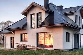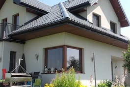 Дом с внушительным корпусом и современными дизайнерскими решениями. Гостевая зона на первом этаже включает гостиную с обеденной зоной и зону отдыха с камином. Большой стол расположен в стеклянном эркере, откуда можно напрямую выйти на террасу. Кухня, открытая в гостиную, интересно организована - с островом и освещена угловым окном, что повышает привлекательность помещения. Комфортабельный и интересно устроенный дом с просторным холлом и удобной лестницей, ведущей на мансарду. В доме четыре просторных комнаты и ванная. Глубокая арка у входа, натуральная облицовка фасада и мансардные окна, освещающие чердак, придают зданию индивидуальный характер.