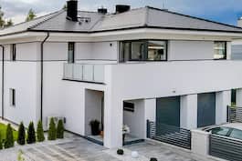 Проект элегантного дома на две семьи, в котором структурная схема позволила спроектировать первый этаж как жилую зону с единым пространством. Современность корпуса дома подчеркивают стеклянные элементы балюстрад, а также цвет и тип облицовки фасада. Гостиная, занимающая всю ширину здания, была открыта для кухни и холла, став центром семейной жизни. Привлекательным элементом является освещение интерьера через современное угловое окно, благодаря которому эта зона выглядит привлекательно, а камин на боковой стене добавляет уюта. Программу дополняют кладовая, туалет и гараж, доступные из тамбура. Чердачное пространство обустроено с учетом комфортного отдыха жильцов, а оригинальное остекление в спальне родителей обеспечивает необычный свет в комнате. Комфортабельные, три светлые комнаты и просторная ванная комната обеспечивают полное расслабление после утомительного дня. Балконы рядом с комнатами образуют частичный навес террасы, а в передней части они создают аркаду вдоль гаража для защиты входа. Данный проект относится к категориям: проекты двухэтажных домов и проекты современных домов.